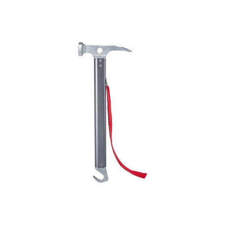 Martello per camping multifunzionale realizzato interamente in metallo con solida testa a 2 battenti martello/piccozza, pratico gancio per l’etrazione dei picchetti e cinturino di sicurezza per la mano